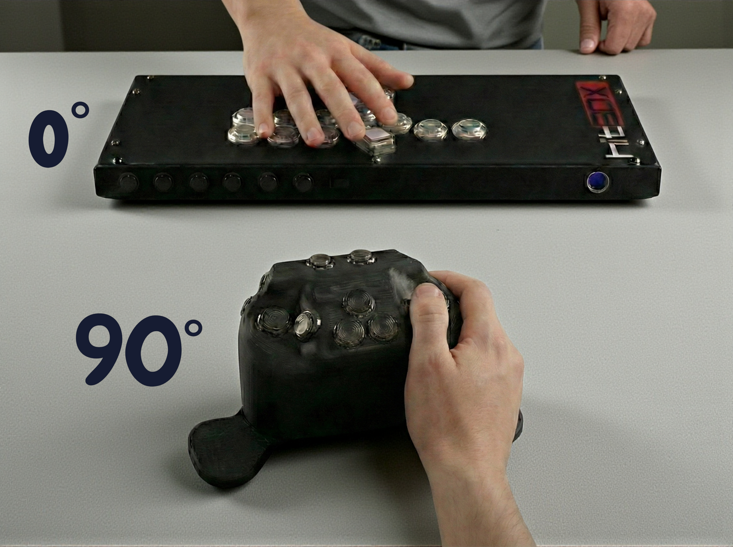 The Vertibox utilizes a near-vertical 90° grip angle to achieve the ultimate handshake position. This design aligns your wrist in its most neutral, biological state. With your palms facing inward, your hand rests naturally on the controller without any muscle or joint pressure. Your fingers remain