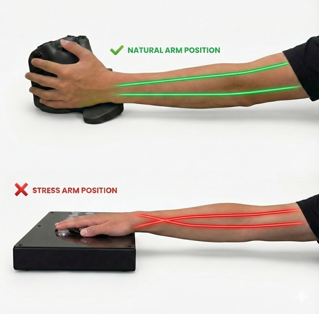 The Vertibox design offers proactive nerve care. Its natural handshake posture aligns the wrist, preventing compression of the median nerve often strained by traditional leverless controller, thus promoting long-term hand and wrist health.
